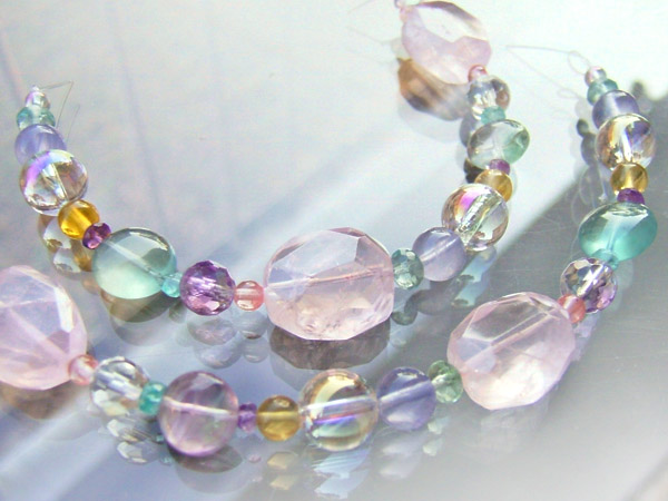 微妙な色合いのフローライトとローズクォーツ、アクアオーラなどでPale illusionというのが出ていたので、作ってみることに。私の大切な方にプレゼントするので、もう一つ違うバージョンを作ります・・。
