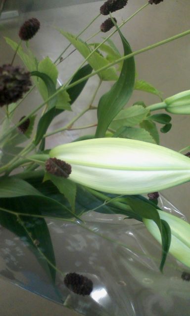 オリエンタルリリーとヒペリカムのブーケを持って。オリエンタルリリーは香りがよいんだって。(まだ花開いてないつぼみ状態でした)